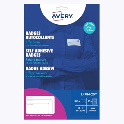 63.5 x 29.6 mm, repositionable, 27 badges per sheet, 540 labels per pack Made from acetate silk, which gives a material-like look and feel Sticks securely and removes easily without leaving any residue Can also be used on fabric storage boxes for home organisation, or as name labels for clothes or backpacks Save time with Avery's easy-to-use templates: Search Avery Design & Print to get started