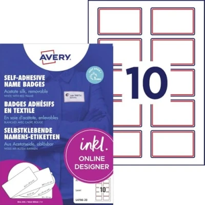 200 white self-adhesive name labels with red border made of high-quality acetate silk in the format 80 x 50 mm – textile labels are the perfect alternative to plastic signs with pin and clip Removable name stickers hold reliably on clothes and are easy to remove without leaving adhesive residue. Not suitable for leather, silk, velvet and sensitive textiles Climate neutral product: CO2 emissions of the product material and manufacturing process compensated by climate projects - the purchase of this product helps to minimise the ecological footprint Ideal for seminars, conferences, events, fairs, events, workshops or for private purposes such as weddings and christenings Suitable for (colour) laser printers - guaranteed jam free printing without smudging. Design and print name tags yourself with free online templates from Avery Zweckform