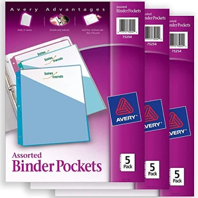 Avery Plastic Binder Pockets, Assorted Colors, 5 Pockets per Pack, 3 Packs (75221)