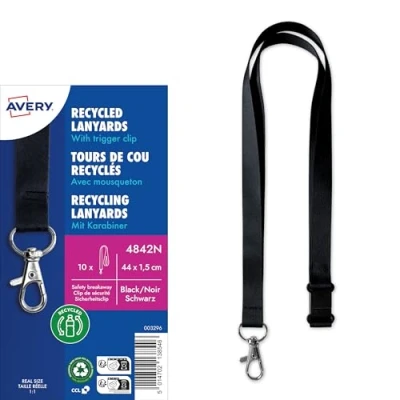 Eco-conscious design made from recycled plastic bottles Satin finish on the flat lanyard for a comfortable fit Easy-to-use swivel metal carabiner hook for convenient attachment. Safety clip provides added security by releasing with excessive force. can be used with Avery's selection of badge holders