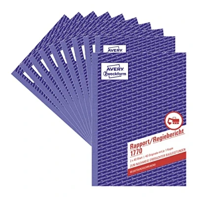 Rapport/director report in a practical pack of 10: DIN A5 - as proof of work performance or construction performance and the performed device use Easy and efficient handling, as it is quick and easy to fill. Robust and cost effective, perfect for travelling and therefore ideal for crafts, construction and construction trade 2 x 40 sheets (40 original and 40 yellow copies yellow) with excellent self-copying paper, all sheets are perforated for quick filing and micro-perforated for easy separation Tested by legal experts - suitable for Germany and Austria Environmentally friendly product / made in Germany: 100% made and processed in Germany - with FSC-certified paper from responsibly managed forests