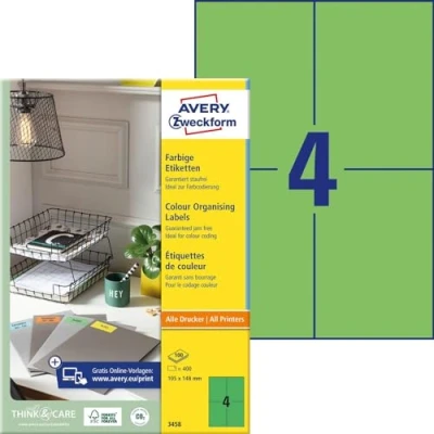 Guaranteed not to jam your printer Free download: The matching templates for Microsoft Word, see product information Box contents: Avery purpose form 3458 coloured labels Green