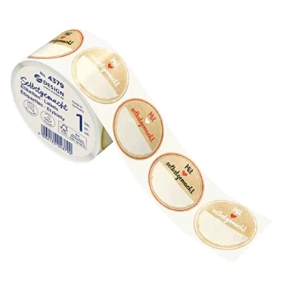 600 high-quality stickers "Mit Liebe selbstgemacht" on a roll in 3 designs, particularly handy to use - ideal for handmade items for Christmas, weddings, birthdays and much more.) Stylish stickers for decorating gifts, homemade items such as jam, chutneys, biscuits, liqueurs, preserves, party favours, as labels for storage and much more. Refined, high-quality paper material in a modern natural look in lovingly coordinated designs - the round stickers are perfect for decorating glasses, storage containers and much more. Made in Germany - produced at the climate-neutral location in Upper Bavaria - greenhouse gas emissions balanced by certified climate protection projects Environmentally friendly product: FSC certified sticker material from responsibly managed forests
