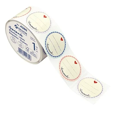 600 high-quality stickers "Homemade" on a roll in 3 designs, particularly handy to use - ideal for handmade items for labelling for Christmas, weddings, birthdays and much more.) Stylish stickers for decorating gifts, homemade items such as jam, chutneys, biscuits, liqueurs, preserves, party favours, as labels for storage and much more. Refined, high-quality paper material in a modern look in lovingly coordinated designs - the round stickers are perfect for decorating glasses, storage containers and much more. Made in Germany - produced at the climate-neutral location in Upper Bavaria - greenhouse gas emissions balanced by certified climate protection projects Environmentally friendly product: FSC certified sticker material from responsibly managed forests