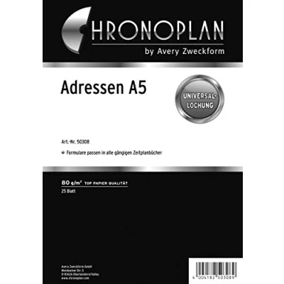 Refill pack with 25 address calendar inserts for many common organisers in DIN A5 format Ideal for creating a neat and clear address collection of contact details in the diary Thanks to universal perforation, fit into many common organisers such as Chronoplan, Time/System, Filofax and many more The address sheets with a high grammage of 80 g/m² have a very good paper quality and are bleached without chlorine The Chronoplan organisational aids for your diary or organiser help you with efficient and clear time management