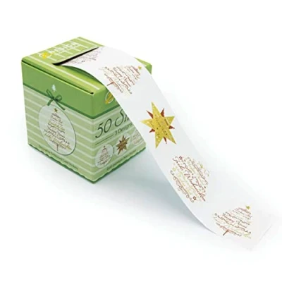 Modern pre-formatted label stickers with Christmas design. Three design variations alternating on a roll of 50. Elegant high quality transparent film with gold emboss gives great shine effects Ideal for Christmas for labelling and decorating Christmas gifts, Christmas cards, Christmas post and much more. 50 labels in high-quality dispensing box for perfect storage, shipping in robust box for intact shipping.