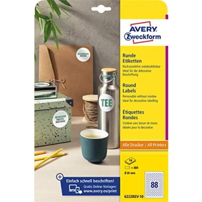 AVERY Zweckform 6222REV 10 Round Labels (880 Adhesive Dots, Diameter 20 mm on A4, Stickers for Printing, Removable Without Residue/Removable, Self Jam Labels), Sheets, White