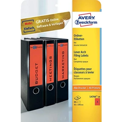 80 permanently self-adhesive, red folder spine labels in short format 61 x 192 mm for wide folders - absolutely opaque material with top adhesive strength for covering old folder labels Innovative ultragrip technology - a three-dimensional profile on the back of the label sheet ensures optimal printer feed and sheet guidance - no more shifted prints Environmentally friendly: FSC certified paper from responsibly managed forests and other controlled sources For wide folders of all standard folder systems such as Leitz, Elba, Mehle, Bene, Biella - folder spine stickers design and print yourself with free online templates from AVERY Zweckform Razor-sharp print image without smudging - guarantees jam-free printer flow on all standard printers without leaving adhesive deposits