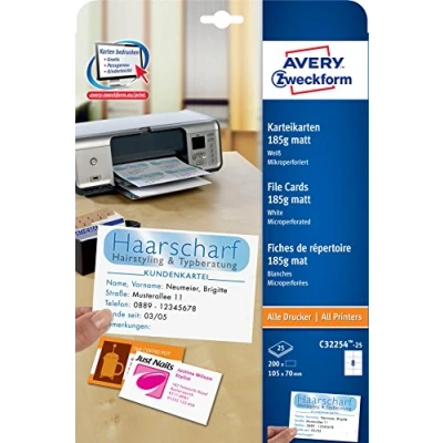 200 index cards with a weight of 185 g in matt white look on 25 sheets DIN A4, printable on both sides Easy removal of index cards from the print sheet thanks to extra-fine micro-perforation FSC certified: paper comes from well-managed forests and is recyclable with the recycled paper, chlorine-free bleached Blank index cards to design and print yourself with free online templates from Avery Zweckform. The link to this can be found on the product packaging or on the AVERY Zweckform website High-quality index cards suitable for inkjet printers, b/w and colour laser printers as well as copiers