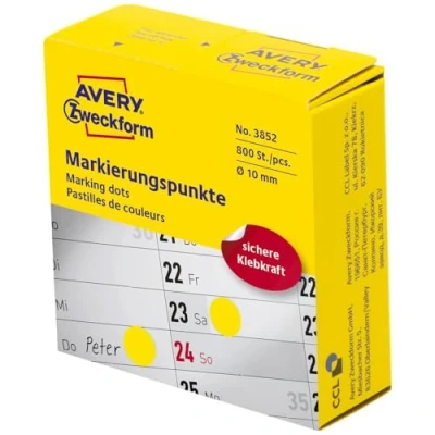800 yellow marker dots with a diameter of 10 mm, for labelling, organising, planning, crafting, marking and organising The round stickers are ideal for hand labelling with all standard writing instruments Coloured round stickers available in small and large sizes, ideal for scheduling appointments and holidays on wall calendars or for labelling certain products such as quality control or inventory Easy to use with sturdy dispenser box: practical self-dispensing function of the stickers, clean storage Environmentally friendly, PVC-free and made in Germany: high-quality, chlorine-free bleached special paper. The colour dots are 100% recyclable with recycled paper