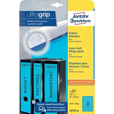 60 permanently self-adhesive, blue folder spine labels in long format 61 x 297 mm for wide folders - absolutely opaque material with top adhesive strength for covering old folder labels Innovative ultragrip technology - a three-dimensional profile on the back of the label sheet ensures optimal printer feed and sheet guidance - no more shifted prints Environmentally friendly: FSC certified paper from responsibly managed forests and other controlled sources For wide folders of all standard folder systems such as Leitz, Elba, Mehle, Bene, Biella - folder spine stickers design and print yourself with free online templates from AVERY Zweckform Razor-sharp print image without smudging - guarantees jam-free printer flow on all standard printers without leaving adhesive deposits Opaque material perfectly conceals any previous inscription or labelling Brilliant white labels for a top-rate, professional look. Smooth printing guaranteed Save time with user-friendly print templates and software All white file labels are made of FSC-certified paper