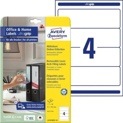 AVERY Zweckform L4761REV 10 Folder Spine Labels (40 with Ultragrip, 61 x 192 mm on A4, Removable, Wide/Short, Self Adhesive, Opaque, Ideal for Home Office) Sheets, White