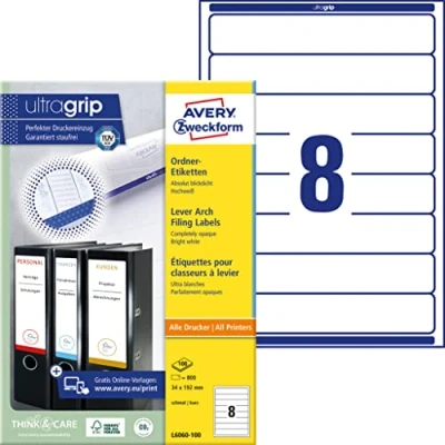 800 permanently self-adhesive, white folder spine labels in short format 34 x 192 mm for narrow folders - absolutely opaque material with top adhesive strength for covering old folder labels Innovative ultragrip technology - a three-dimensional profile on the back of the label sheet ensures optimal printer feed and sheet guidance - no more shifted prints Environmentally friendly: FSC certified paper from responsibly managed forests and other controlled sources For narrow folders of all standard folder systems such as Elba, Bielle, Flhle - folder spine stickers design and print yourself with free online templates from AVERY Zweckform Razor-sharp print image without smudging - guarantees jam-free printer flow on all standard printers (laser confirmed by TÜV SÜD) without leaving adhesive deposits