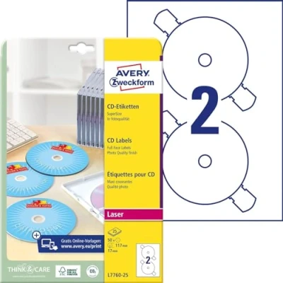 Avery Zweckform L7760 25 CD Labels (A4, Pack of 50, High Gloss, 117 mm Diameter) Sheets White