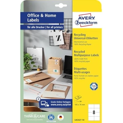 AVERY Zweckform LR3427 10 Recycled Labels (80 Address Labels, 105 x 74 mm on A4, 100% Paper, Printable Shipping Self Adhesive Labels), Sheets, Natural White