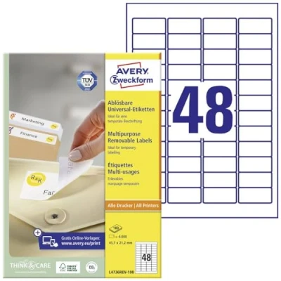 4,800 white, removable labels in the format 45.7 x 21.2 mm - with top adhesion on different surfaces - save with the 100 sheet pack, our bulk pack Use the removable stickers to temporarily label products, documents or documents. Secure adhesion, but can be removed if necessary - without adhesive residue Environmentally friendly: FSC certified paper from responsibly managed forests and other controlled sources Razor-sharp print image without smudging - guarantees jam-free printer flow on all standard printers (laser confirmed by TÜV SÜD) without leaving adhesive deposits Simply design and print blank labels yourself with free online templates from AVERY Zweckform - the link can be found on the product packaging or on the AVERY Zweckform website