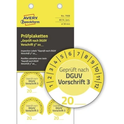 AVERY Zweckform Pack of 80 Test Badges, Tested According to DGUV Regulation 3 20 (with Year Enter Yourself, Durable, self Adhesive, 30 mm, Sticker, Seal Made Vinyl) 7908 Yellow