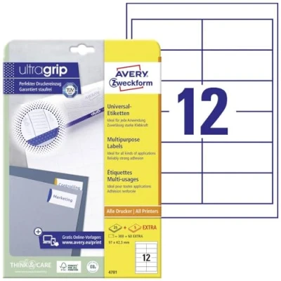 360 white, self-adhesive blank labels in the format 97 x 42.3 mm - with top adhesion on different surfaces - free additional contents per pack: plus 5 sheets (60 labels) extra Unique ultragrip technology - a three-dimensional profile on the back of the label sheet ensures optimal printer feed and sheet guidance - ideal for batch processing and mail merge Environmentally friendly: FSC certified paper from responsibly managed forests and other controlled sources Environmentally friendly product/CO²-neutral company: with FSC-certified paper from responsibly managed forests - CO₂ emissions compensated at the company site by climate projects Razor-sharp print image without smudging - guarantees jam-free printer flow on all standard printers (laser confirmed by TÜV SÜD) without leaving adhesive deposits Simply design and print blank labels yourself with free online templates from AVERY Zweckform - the link can be found on the product packaging or on the AVERY Zweckform website