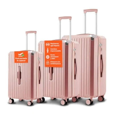 The 3-piece suitcase set includes three different size trolleys (55, 66, 76 cm), ideal for meeting the needs of short or long term travel, offering versatile options for any occasion. The trolleys are made of ABS, a material that provides excellent impact resistance and protection against the elements, keeping the contents safe during the journey. The 4 double wheels of the suitcase set allow for optimal manoeuvrability on uneven floors, bumpy roads or smooth surfaces, ensuring effortless transport. Despite the sturdiness, the suitcases in the set are lightweight, easy to lift and convenient to carry, minimizing stress during travel. Each trolley has a well-organized interior with a mesh bag for small accessories and an elastic garment holder to keep your clothes tidy and stable while traveling.