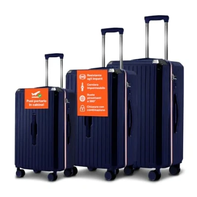 The 3-piece suitcase set includes three different size trolleys (55, 66, 76 cm), ideal for meeting the needs of short or long term travel, offering versatile options for any occasion. The trolleys are made of ABS, a material that provides excellent impact resistance and protection against the elements, keeping the contents safe during the journey. The 4 double wheels of the suitcase set allow for optimal manoeuvrability on uneven floors, bumpy roads or smooth surfaces, ensuring effortless transport. Despite the sturdiness, the suitcases in the set are lightweight, easy to lift and convenient to carry, minimizing stress during travel. Each trolley has a well-organized interior with a mesh bag for small accessories and an elastic garment holder to keep your clothes tidy and stable while traveling.
