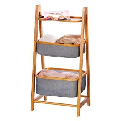LARGE STORAGE SPACE - 2 folding baskets and 1 shelf provide space for storing towels, accessories, linen and more. DURABLE MATERIALS - Constructed of eco-friendly and fast-growing bamboo, known for its toughness and moisture resistance. The baskets are made of polyester/cotton blend, durable and easy to clean. VERSATILE DESIGN: Perfect for use in the bathroom, laundry room, bedroom or anywhere else in the home. The neutral style will compliment any decor. Foldable Functionality: Easy to assemble and disassemble without tools. Foldable to save space when not in use. Size: Measures 33 x 45 x 99cm when unfolded. Compact size makes it ideal for even the smallest of spaces.