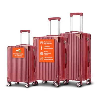 The 3-piece suitcase set includes three different size trolleys (55, 66, 76 cm), ideal for meeting the needs of short or long term travel, offering versatile options for any occasion. The trolleys are made of ABS, a material that provides excellent impact resistance and protection against the elements, keeping the contents safe during the journey. The 4 double wheels of the suitcase set allow for optimal manoeuvrability on uneven floors, bumpy roads or smooth surfaces, ensuring effortless transport. Despite the sturdiness, the suitcases of the set are lightweight, easy to lift and convenient to carry, minimizing stress during travel Each trolley has a well-organized interior with a mesh bag for small accessories and an elastic garment holder to keep your clothes tidy and stable while traveling.