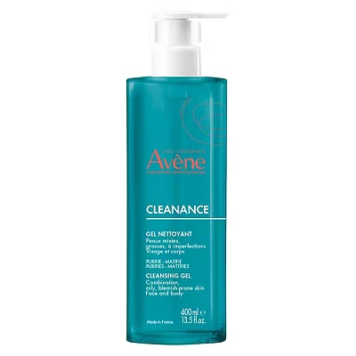 Avène Cleanance Cleansing Gel 400ml is a purifying, soap-free gel cleanser formulated for oily, blemish-prone and sensitive skin. This lightly foaming daily wash effectively removes excess oil, impurities and makeup while soothing and balancing the skin without over-drying. It’s suitable for both face and body and is designed to respect sensitive skin with very good tolerance. Key BenefitsDeep cleansing & purifying: Gently lifts away dirt, sebum and daily buildup for a refreshed complexion. Mattifying effect: Helps reduce excess oil and shine for a more balanced, less greasy look. Soothes sensitive skin: Enriched with Avène Thermal Spring Water to calm inflammation and irritation. High tolerance & skin-friendly: Soap-free, physiological pH and biodegradable formula that respects delicate skin. Versatile use: Can be used on face and body, including areas prone to breakouts like the back or chest. Why It WorksThe formula blends gentle surfactants with Comedoclastin™, a plant-based active ingredient that helps regulate sebum production and reduce shine, along with zinc gluconate to soothe and support clearer skin. The result is a clean, refreshed and mattified complexion without stripping essential moisture.
