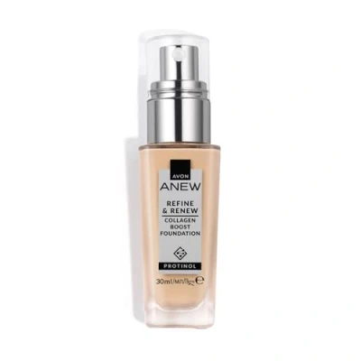 MAKEUP & SKIN-CARE IN 1 - See a new level of visible results and boost skin's natural luminosity with Anew Refine & Renew Collagen Boost Foundation, developed by Anew skincare experts. Powered by skin science - this collagen-boosting liquid foundation is formulated with award-winning Protinol to help stimulate skin to naturally produce 50% more collagen for a more resilient, plumper, and firmer-looking complexion. BLURRING TECHNOLOGY - This is the silken foundation that helps erase signs of fatigue without settling into fine lines, with SPF30 to help protect your skin from the sun. It also visibly improves your skin texture each time you wear it, helping it look more refined, rejuvenated and energised, as if lit from within. HOW TO USE: We recommend applying with our Flat Foundation Brush or Full-Coverage Foundation Brush for a pro finish. Blend the foundation out around your hairline, jawline and neck with our Flat Buffing & Stippling Brush for a seamless finish. Cover any imperfections that are still showing with the Anew Protinol Concealer. CRUELTY FREE - We don't test a single product or ounce of ingredient on animals. In fact, we're actively against it, campaigning for acceptance on non-animal testing methods for more than 3 decades. AVON - We're passionate about keeping you at the centre of beauty, creating products that embrace the latest trends and cutting-edge technology, alongside everyday essentials that will be the staples of your beauty kit.