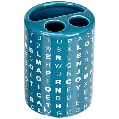AWD Interior Toothbrush Holder, Ceramic with letter pattern, Blue and White, 8 x 10,9 cm