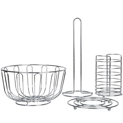 Practical 4-piece kitchen set consisting of fruit basket, cutlery stand, wire coaster and kitchen roll holder - ideal for more order and overview in the home. All set components made of chrome-plated metal in a silver timeless look - kitchen utensil container and coaster set with stylish spherical feet for the kitchen, dining room, BBQ etc. Dimensions: wire basket diameter approx. 23.5 cm, height approx. 13 cm, kitchen utensil holder diameter approx. 11 cm, height approx. 17 cm, coaster diameter approx. 18 cm, height approx. 1.5 cm, kitchen paper holder, diameter approx. 13 cm, height approx. 31.5 cm. Weight: approx. 725 g. Set consisting of a modern fruit bowl for storing fruit or even bread rolls in the basket – storage aid for the sorted and handy setting of cutlery and kitchen roll as well as for placing pot or pan. Package includes: 1 x set of wire tray, 1 x cutlery basket, 1 x pan coaster, 1 x kitchen roll holder