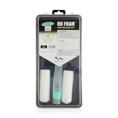 COMPLETE KIT: The HD foam mini roller kit is for professional painters. It includes two 4-inch mini roller sleeves, a tray, and a rust-resistant frame. ULTRA HIGH DENSITY: Our foam roller sleeve is made from high-density HD foam, making it deformation-resistant. The high-quality construction allows for excellent paint pick-up and release, reducing streaks and providing a professional finish on any surface. PRECISION PAINTING: Our foam roller is perfect for painting wood and metal surfaces, including trims, architraves, skirting, and architectural fixtures, with precise coverage and no mess. It works well with various types of paint, including varnishes and oil-based paints. ERGONOMIC FRAME: The roller frame has a 6mm heavy-duty construction and a soft grip to reduce hand strain during prolonged use. The bottom of the frame is threaded to allow for secure attachment to extension poles. RECYCLED PLASTIC TRAY: This tray is constructed from recycled plastic material. The tray's surface is ribbed, allowing for an even paint distribution. It also has a hanging slot for easy storage., Manufacturer: Axus Décor