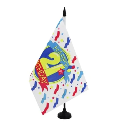 QUALITY MATERIAL: Made of 100% polyester fabric, this Happy 21st Birthday table flag has a high precision laser cut finish. Satisfaction guaranteed! PLACE IT WHEREVER YOU WANT : This 21th Birthday's party flag on a base with intense colors can be placed on a desk, a table, a buffet, a fireplace... For an original and successful interior decoration. BASE SUPPLIED : Proposed with a detachable black plastic base, this table decoration is simply put on the flat surface of your choice. The flag is ready to use. A HIGHLY PRIDEFUL TABLE DECO: For cultural, sports, professional or family events... this small flag of Happy 21st Birthday will adorn your tables and facilities the decoration of your spaces according to your desires. YOUR FLAGS REFERENCE: AZ FLAG is a brand specialized from 2009 in the production and distribution of flags from all over the world. Choose a brand that stands for quality