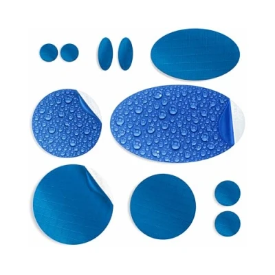 QUICK DIY REPAIR KIT - it takes seconds to apply the waterproof patch kit to the ripped fabric on your down jacket, puffer coat, or air mattress bed, tent, RV, rubber boats, inflatables, pool, bouncy castles, hot tubs, kayak, ski clothing, shoes or bag KIT OF 11 SHAPES AND SIZES - each mending set includes 11 pre-cut, self-adhesive, high-quality patches (1 oval 3.15x1.9in, 1 oval 1.18x1.96in, 2 ovals 0.4x0.78in each, 1 circle 1.96in diameter, 2 circles 1.57in, 2 circles 0.59in and 2 circles 0.4in) DURABLE AND LONG-LASTING - rip-stop heavy-duty nylon polyester fabric is waterproof, sub zero temperature, tear, heat resistant and can be used to fix holes and rips in torn pvc fabric, air matresses beds, boats, inflatables, bouncy castles, hot tubs, kayaks, umbrellas, gloves, bags, backpacks, skiing clothing, sleeping bags, down jackets, tents HOW TO USE: clean and dry the area around the hole, rip or tear that needs to be patched (if there are feathers sticking out, push them inside under the fabric), select the appropriate size and shape of the pre-cut patch, peel it off and stick to the area that needs to be fixed. You are all set! No sewing or ironing required SUPERIOR SERVICE - we cut no corners in our product & will cut no corners in providing top-notch service to you