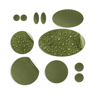QUICK DIY REPAIR KIT - it takes seconds to apply the waterproof patch kit to the ripped fabric on your down jacket, puffer coat, or air mattress bed, tent, RV, rubber boats, inflatables, pool, bouncy castles, hot tubs, kayak, ski clothing, shoes or bag KIT OF 11 SHAPES AND SIZES - each mending set includes 11 pre-cut, self-adhesive, high-quality patches (1 oval 3.15x1.9in, 1 oval 1.18x1.96in, 2 ovals 0.4x0.78in each, 1 circle 1.96in diameter, 2 circles 1.57in, 2 circles 0.59in and 2 circles 0.4in) DURABLE AND LONG-LASTING - rip-stop heavy-duty nylon polyester fabric is waterproof, sub zero temperature, tear, heat resistant and can be used to fix holes and rips in torn pvc fabric, air matresses beds, boats, inflatables, bouncy castles, hot tubs, kayaks, umbrellas, gloves, bags, backpacks, skiing clothing, sleeping bags, down jackets, tents HOW TO USE: clean and dry the area around the hole, rip or tear that needs to be patched (if there are feathers sticking out, push them inside under the fabric), select the appropriate size and shape of the pre-cut patch, peel it off and stick to the area that needs to be fixed. You are all set! No sewing or ironing required SUPERIOR SERVICE - we cut no corners in our product & will cut no corners in providing top-notch service to you