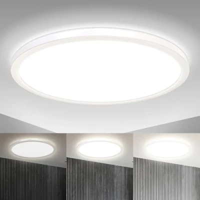MULTIFONCTION: This ultra-flat LED ceiling panel is dimmable by a simple on/off switch (3 levels: 10%/50%/100%), no dimmer needed. In addition, the light offers an indirect background light, which gently illuminates the ceiling. The memory function saves your last settings. LIGHTING: a powerful 22 Watt built-in LED board offers 3000 Lumen of neutral white day light for your living room & dining room, kitchen, hall, office, hallway or bedroom. INSTALLATION: The round ceiling panel is made of shock-resistant high quality resin and is fixed to the ceiling plate by a simple bayonet fastening. For your convenience all necessary mounting material is provided: 3 dowels, 3 screws as well as clear instructions. DIMENSIONS: the office lamp measures Ø420mm/16.5in. in diameter for a total height of only 29mm/1.1in. This ultra slim design blends in with your decor and remains very discreet. The IP20 protection is suitable for all rooms inside the house, except bathrooms. The ceiling lamp LED creates a beautiful atmosphere in your home