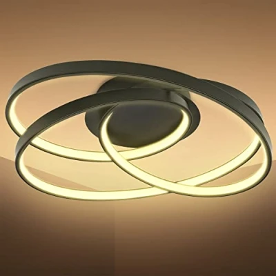 This stylish and modern LED ceiling lamp comes with a warm white light of 3.000 Kelvin. The built-in 35W LED board provides 4600 lumens of brightness and fits perfectly for all your living spaces: hall lamp, living room lamp, dining room lamp and office lamp. The LED ceiling light is black and made of easy-care plastic. The light source consists of a continuous, curved ring and provides a modern and loosening atmosphere. The round living room lamp has the following dimensions: 390x395x145mm/ 15.3x15.5x5.7in. The canopy measures 150mm/ 5.9in. The mounting holes have a distance of 110mm/ 4.3in. The scope of delivery includes the LED ceiling light and all necessary mounting material incl. mounting instructions. The luminaire is not dimmable and cannot be swivelled.