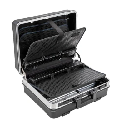Tool case from B&W International made from sturdy ABS plastic: rugged aluminium rim with reinforced corners | locking latches | combination lock | ergonomic handle | hinged lid | safety lid holder | 4 feet Sturdy tool case with flexible interior system: total of 9 tool storage systems plus a variable aluminium divider system in the main compartment The flex module includes a removable tool board in the lid with 3 module tool-holders for tools with Ø 21 mm on the front and back and a removable cover board for the main compartment with 3 modular tool-holders for tools up to Ø 28 mm Inner dimensions: 47 x 36.5 x 20 cm | Outer dimensions: 50 x 42.5 x 21 cm | Volume: 34.3 l | Weight: 5.7 kg | Load capacity: 30 kg | Colour: black | Material: Acrylonitrile butadiene styrene (ABS) Also available with LOOP interior tool loops system or POCKETS tool pockets, Weight: 10.58 pounds, Manufacturer: B&W International