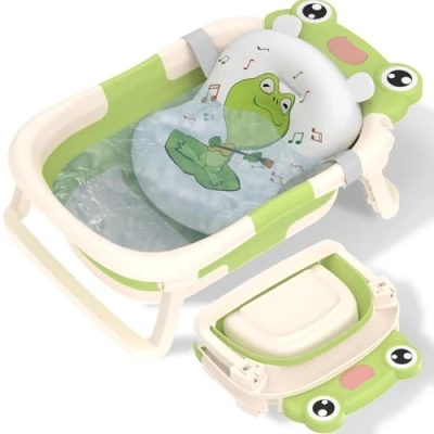【Foldable Baby Bath Tub】: The Cute Frog baby bathtub is every family's welcome baby essentials for newborn, Sweetmirth bathtub doesn't take up much space. In just three simple steps, can be folded to a thickness of 15cm to make more space for living, it can be stored hanging through the pre-drilled holes on the edge of the bathtub and its portable design makes it ideal for travel. 【High Quality Material & Stable Construction】: The newborn tub is made crafted from eco-friendly PP + TPE materials, the Cute Frog newborn bathtub offers a non-slip surface and excellent heat retention, ensuring it is free from toxic substances. You can use it with complete confidence. The wide support base includes non-slip pads and reinforced support rods to prevent sliding, providing stability and ensuring a safe, comfortable bathing experience for your little one. 【Comfortable Padding with Detachable Cushion】:Our toddler bath tub comes equipped with a soft, removable bath cushion that comfortably cradles your infant's body, safely preventing water from entering the mouth and protecting the baby's spine from shock. It floats effortlessly on the water. As your baby grows, the bath support pad can be easily removed when no longer needed. 【Temperature Sensing】: The built-in temperature-sensitive drain plug turns white when the water temperature reaches 39 degrees, helping you monitor the temperature so parents can know the bathwater temperature in advance. When the shower is over, opening the drain plug at the bottom of the tub allows the water to drain quickly and easily. 【Practical Design】: This foldable baby bath tub measures approximately 60 x 40 x 21cm when unfolded, suitable for your baby from newborn to toddler (0-24 months), ensuring a pleasant and safe bathing experience at every stage of their growth.