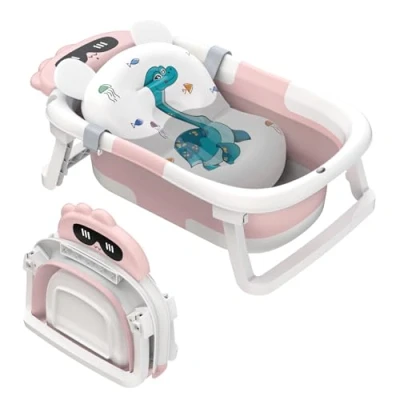 Strong and Reliable Construction: Crafted from high-quality PP materials, our baby bath tub ensures exceptional durability for everyday use. The robust wide support base guarantees stability, while the reinforced support bar and raised non-slip bottom create a secure environment for your baby. Designed to withstand regular use, this collapsible baby bath remains a dependable choice as your child grows Easy Temperature Monitoring: Equipped with a thermosensitive drainage plug, this baby bathtub allows for effortless water temperature monitoring. The is dark blue plug indicates safe temperatures below 45°C, changing to light white when the water exceeds 45°C. This feature ensures your baby enjoys a safe and comfortable bath every time (Note: Thermometer not included.) Space-Efficient and Portable: Featuring a space-efficient double-fold design, this foldable baby bath folds down to just 7.5 cm thick, making it ideal for modern family living. The tub's compact size makes it convenient for storage in tight spaces or for transport during travels. Whether at home or on the go, this toddler bath includes essential accessories for newborns, ensuring you have everything you need for a hassle-free bathing experience Versatile Size for Various Settings: Measuring approximately 60 x 40 x 20 cm (23.62 x 15.74 x 7.87 inches) when unfolded, our foldable baby bathtub is suitable for a variety of bathing scenarios. Whether used in a stand Enjoy Safe and Fun Bath Time: Ensure your baby enjoys a delightful and secure bathing experience with our innovative baby bath tub. This tub features a soft, removable non-slip bath mat with a playful dinosaur design to keep your little one entertained. The adjustable straps provide crucial neck and back support, minimizing the risk of slips and falls. Always supervise your child to prevent accidents and enhance your bonding experience
