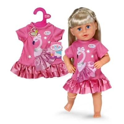 IN MATCHING STYLE - This sweet pink dress with short sleeves features a lovely flamingo design with shiny satin ruffles - both at the hem & on the flamingo itself. SPARKLE & SHINE - Glittering satin trims & a silver star print turn this outfit into a true eye-catcher for magical dress-up fun. FITS ALL 43CM DOLLS - Perfectly sized for all BABY born 43cm dolls, including the BABY born Teddy. HIGH-QUALITY ACCESSORY - The BABY flamengo dress is the perfect addition for extended, varied & long-lasting play enjoyment. QUALITY SINCE 1991 - BABY born stands for long-lasting play fun & trusted quality that parents have relied on for generations., Manufacturer: Baby Born