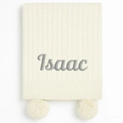 Baby Boy Girl Personalised Cable Knit Pom Blanket Embroidered Name (Cream)