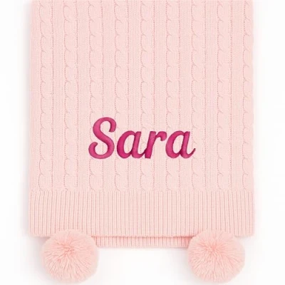 Baby Boy Girl Personalised Cable Knit Pom Blanket Embroidered Name (Pink)