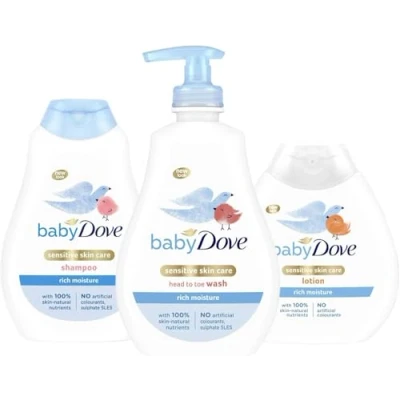 Baby Dove Sensitive Skin Care Rich Moisture Set: Head to Toe Wash 400ml, Shampoo 400ml and Lotion 200ml