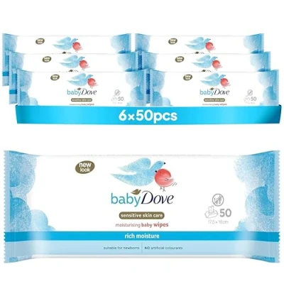 SOFT & GENTLE CLEANSING - Baby Dove Rich Moisture Wipes offer a tender cleaning solution for your baby's delicate skin. Formulated without harsh additives, artificial colourants, or alcohol, these hypoallergenic wipes provide a nurturing touch ideal for daily hygiene and changes, leaving the skin moisturised and soft. SUITABLE FOR SENSITIVE SKIN - Tailored for the most delicate skin, these wipes are a comforting choice for daily hygiene. Baby Dove Wipes' gentle and safety-tested formula is dermatologically and paediatrician tested, ensuring our mild and caring ingredients make them suitable even for newborns. They provide reassuring cleanliness and care without causing dryness or irritation. CONVENIENT PACKAGING - Convenience meets care with the easy-to-pull design of Baby Dove Wipes. The resealable pack ensures the wipes stay moist, making them a reliable, fresh solution for spontaneous clean-ups and diaper changes, at home or on the move. VERSATILE WIPES FOR ALL-OVER USE - Not just for nappy changes, Baby Dove Wipes can be used for cleaning the face and hands too. Soft and durable, they are a must-have in your nappy bag for any messy situation. ESSENTIAL PACK INFO - This multipack, containing 6 packs of 50 wipes each, is an essential addition to your baby care routine. The practical size of the wipes and the volume of the pack ensure you have a dependable, caring cleaning option for your baby, wherever you are.