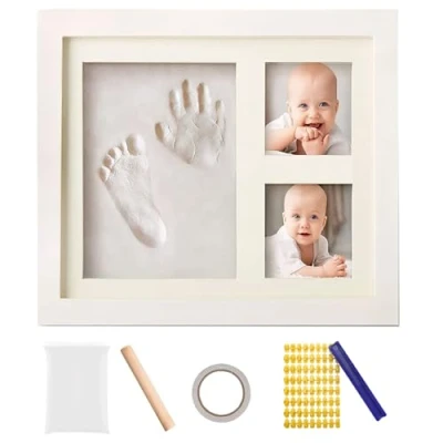 🎁Perfect Set: Baby handprint and footprint kit includes 1 frame, 1 clay, 72 letter molds, 1 rolling pin, and 1 double-sided tape. This baby hand print and foot print frame includes everything you need to preserve your baby's handprint and footprint, making it a thoughtful baby shower gift or a gift for new parents. 🎁Easy to Use: Simply knead the clay for five minutes until it becomes soft and smooth. Place it in the frame area and smooth it out using the provided wooden stick. Press your baby's tiny handprint and footprint into the clay and let dry. 🎁High-Quality and Safe Materials: This baby feet and hand printing kit is made with safe and non-toxic clay and a wooden frame, ensuring it will be treasured for years. 🎁Unique Baby Keepsake: This newborn keepsake photo frame features your baby's handprint and footprint, displayed alongside a photo of your baby in a high-quality wood frame, making it a one-of-a-kind baby keepsake. The baby feet and handprint kit is an elegant and meaningful nursery decoration to cherish for a lifetime. 🎁Great Gifts: A newborn hand and footprint kit is a perfect gift for newborn showers and baths, capturing the good memories of your little one. This baby handprint keepsake kit has everything you need, no extra accessories required. Perfect for baby showers, registries, baby welcome parties, Christmas.