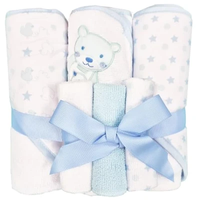 Baby Hooded Towel & Flannel Set 6 Pc Wash Cloths Soft Absorbent (Blue Bear)