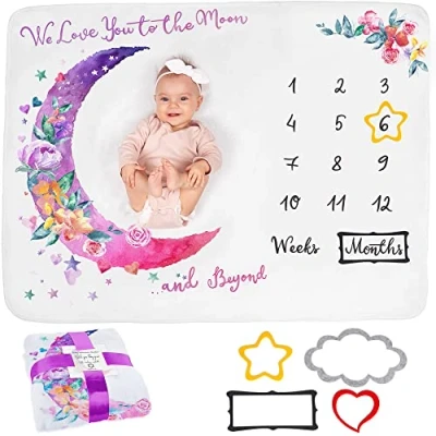 CAPTURE THE MOMENT - Wouldn’t you love to create unique memories of your baby’s growth during their first year? Our moon milestone blanket is the best way to capture all these beautiful milestones in your baby’s life and share pictures with your friends and family. Watch your baby grow! MOON & FLOWERS BABY SHOWER GIFT - This blanket will make an excellent gift for any expectant mum. It is delivered in a pretty package and comes elegantly folded with a nice ribbon! Our unique design includes a beautiful watercolored moon with flowers and stars and will go great with any themed party. THICK, SOFT & COMFORTABLE - The super soft and thick blanket will feel comfortable for your baby’s sensitive skin, and the mat is large enough so your baby can grow and still fit on it. Even after washing it will still feel soft and keep all its colours. MULTIFUNCTIONAL & VERSATILE - Our 130 x 100 cm blanket can be used as a nursing cover, muslin swaddle blanket, play mat, stroller cover, burp cloth or even as a warm cover for the first winter days. The package contains four coloured frames that you can use to highlight your baby’s milestones. QUALITY YOU CAN TRUST - We are dedicated to providing the best products and service to all our customers. If you are not happy with our product for any reason at all, please get in contact with us and we will happily refund your order – no questions asked.