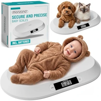 WEIGHS UP TO 20 KG WITH ±10 G PRECISION - The digital MONZANA baby weighing scale accurately measures from newborn up to 20 kg, with a fine graduation of ±10 g. Ideal for long-term weight monitoring of babies and toddlers, helping you track healthy growth and development month after month from the comfort of your home. TARE & HOLD FUNCTION FOR ACCURATE RESULTS - The integrated tare function allows you to subtract the weight of blankets, muslins or clothing at the touch of a button, so you see only your baby's true body weight. The practical hold function stabilises the reading - perfect if your newborn moves during weighing. Easily switch between kg and lb using the UNIT button. MULTI-PURPOSE BABY & PET SCALE - More than just a newborn baby scale. Suitable for infants, toddlers and also ideal as a small pet weighing scale for cats, puppies, rabbits and small dogs. A versatile digital scale designed for growing families and pet owners alike. LARGE, SAFE & ERGONOMIC WEIGHING TRAY - Featuring a generous 55 x 32 cm curved weighing surface, this infant scale provides comfort and security while weighing. The gently contoured design helps keep your baby safely positioned, while non-slip rubber feet ensure maximum stability on flat surfaces. EASY-TO-READ LCD DISPLAY & SIMPLE OPERATION - The large LCD display shows clear, quick results for stress-free weighing. With automatic switch-off to preserve battery life, battery level indicator and simple one-button unit conversion (kg/lb), this baby weighing scale is a reliable everyday essential for every parent.