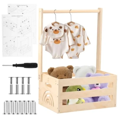 Baby Shower Crate Closet, Wooden Basket with Handle, Hollow Out Design Clothes Rack, Hamper Storage for New Born Pregnancy Parent Gifts(Style E)