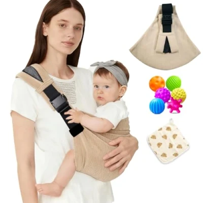 【3 in-1 Ways to Carry】: According to the baby’s regularity of spine development, this baby carrier is designed with three combinations, you can choose the ways of holding the baby according to your baby's growth and needs. 【One Size Fits All】: This Baby Carrier newborn to toddler is suitable for children aged 0-36months and weighing 7lb-33lb. 52 inches Lengthen belt is suitable for parents of different figures. 【What you get】 : 2 pcs different colors and shapes of toddler sensory ball, there are a variety of ways to play, colorful, more can attract the attention of the baby, 1pcs Baby Muslin Washcloths for Unisex 100% Cotton ,1pcs Convenient travel Baby Sling. is the holiday, Birthday, Thanksgiving and New Year's Christmas gift for your family and friends. 【High-quality Fabric】: The baby backpack carrier is made of soft classic fabric with a polyester texture. Natural, soft and comfortable, breathable, skin-friendly and durable, suitable for all seasons. The pure cotton saliva towel is soft and moisture-absorbing, can absorb the baby's saliva and nasal mucus, keep the face clean and dry, and it is not easy to pill after repeated washing. 【Reasonable Weight-bearing Distribution】: Thicken the shoulder straps and widener waist belt evenly distribute the force on the abdomen, waist, and s houlders of adults to prevent long-term unreasonable weight-bearing from causing spinal injuries.